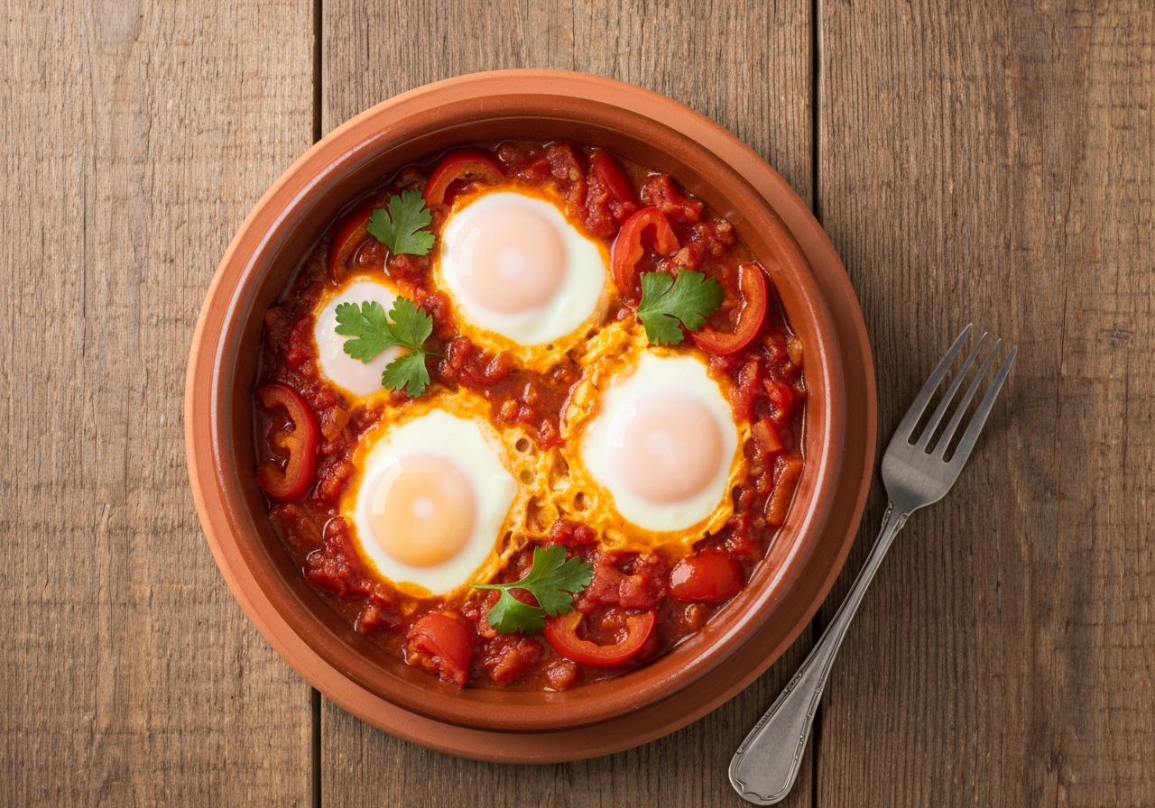 Eggs gently poached in a rich, spiced tomato and pepper sauce — a one-pan wonder that works for breakfast, lunch, or dinner.